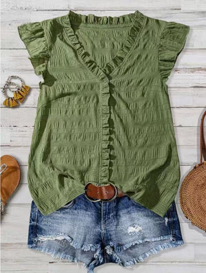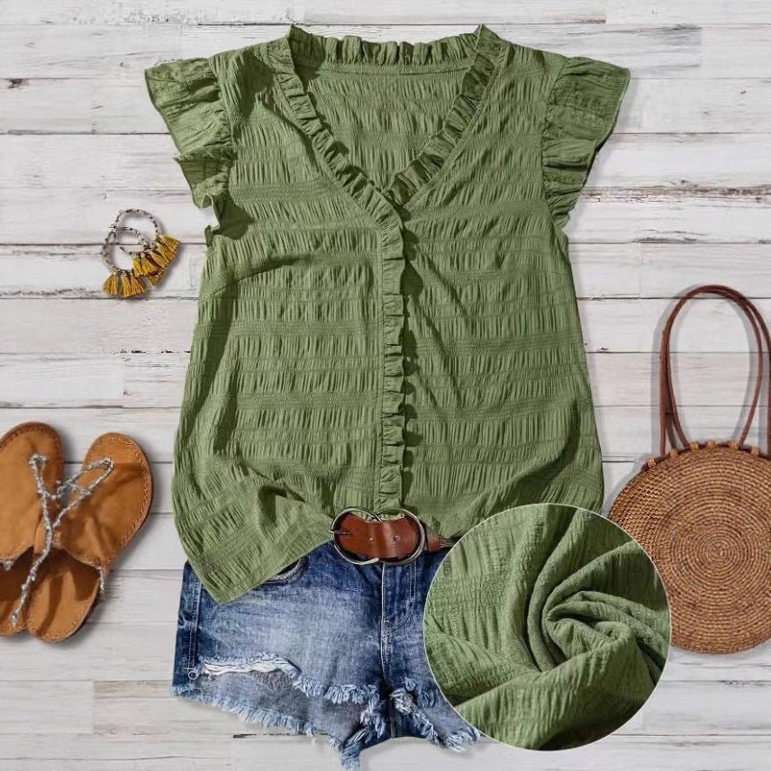 Upgrade your wardrobe with this army green striped V-neck women shirt, featuring stylish pleats and ruffle sleeves for a trendy Japanese/Korean casual look. Crafted from soft and durable polyester fabric, this shirt ensures comfort while maintaining a chic appearance.